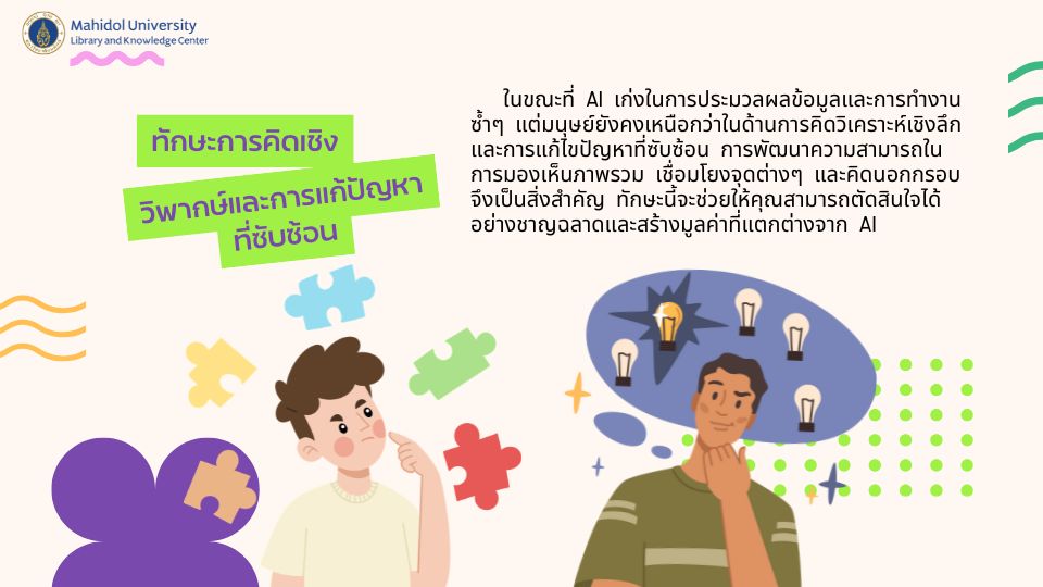 แม้ AI จะสามารถประมวลผลข้อมูลมหาศาลได้ในชั่วพริบตา แต่ "หัวใจ" ของการตัดสินใจที่ชาญฉลาดยังคงเป็นหน้าที่ของมนุษย์ ทักษะนี้เน้นที่การมองภาพรวม การเชื่อมโยงข้อมูลที่กระจัดกระจาย และการคิดนอกกรอบเพื่อสร้างแนวทางใหม่ๆ ซึ่งช่วยสร้างมูลค่าที่แตกต่างและยั่งยืนเหนือกว่าที่ระบบอัตโนมัติจะทำได้