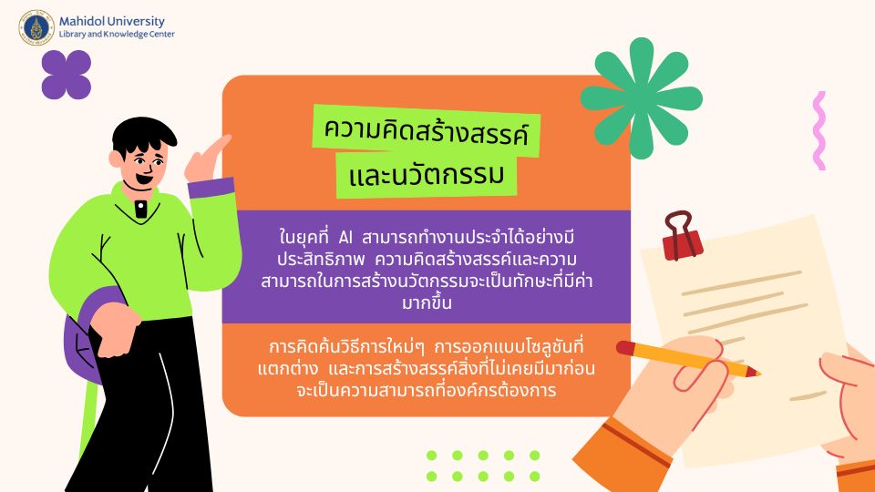 เมื่อภาระงานประจำวันถูกส่งต่อไปให้ AI ทำงานแทน ความคิดสร้างสรรค์จะกลายเป็นสินทรัพย์ที่มีค่าที่สุดของมนุษย์ การคิดค้นโซลูชันที่ไม่เคยมีมาก่อนและการสร้างสรรค์สิ่งใหม่ๆ คือสิ่งที่องค์กรในอนาคตต้องการมากที่สุด เพราะนี่คือทักษะที่นำไปสู่ความก้าวหน้าและการเติบโตอย่างแท้จริง