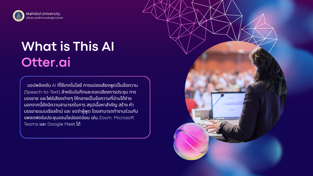 นี่คือแอปพลิเคชันผู้ช่วย AI ที่ใช้เทคโนโลยี Speech-to-Text เพื่อเปลี่ยนเสียงพูดทุกคำให้กลายเป็นข้อความที่อ่านง่ายโดยอัตโนมัติ ไม่เพียงแค่นั้น Otter.ai ยังช่วยสรุปเนื้อหาสำคัญ สร้าง Action Items และเป็นบอทเข้าร่วมประชุมแทนคุณได้!