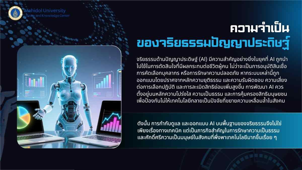 ในยุคที่ AI มีบทบาทต่อการตัดสินใจด้านสำคัญของชีวิต การมีจริยธรรมช่วยลดความเสี่ยงจากอคติการเลือกปฏิบัติ และการละเมิดสิทธิของบุคคล