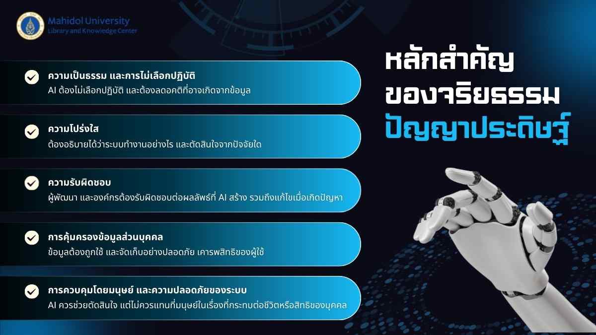 การพัฒนา AI ควรยึดหลักความเป็นธรรม ความโปร่งใส ความรับผิดชอบ การคุ้มครองข้อมูลส่วนบุคคล และการควบคุมโดยมนุษย์เพื่อให้การใช้งานเกิดความปลอดภัยสูงสุด