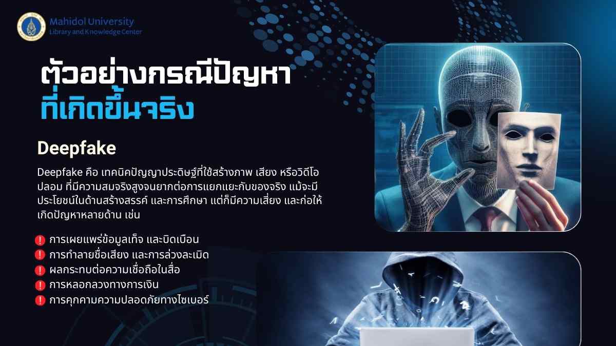 Deepfake เป็นการใช้ AI สร้างภาพ เสียง หรือวิดีโอปลอมที่สมจริง ซึ่งอาจก่อให้เกิดการบิดเบือนข้อมูลการหลอกลวง และการละเมิดชื่อเสียงของผู้อื่น