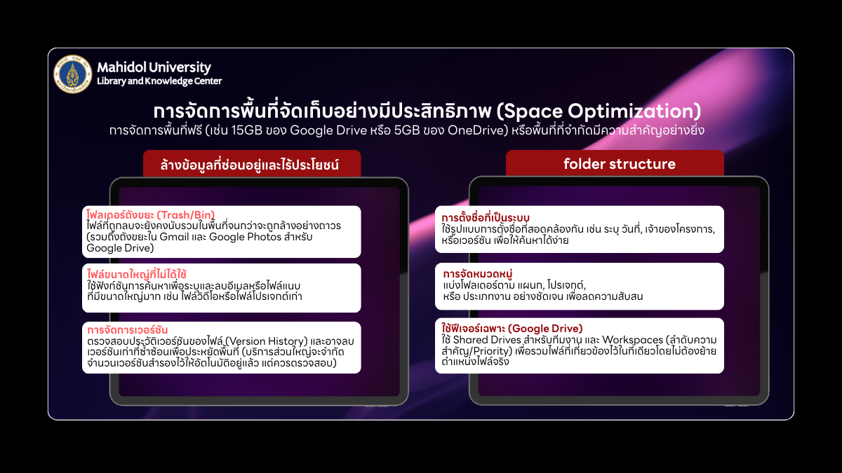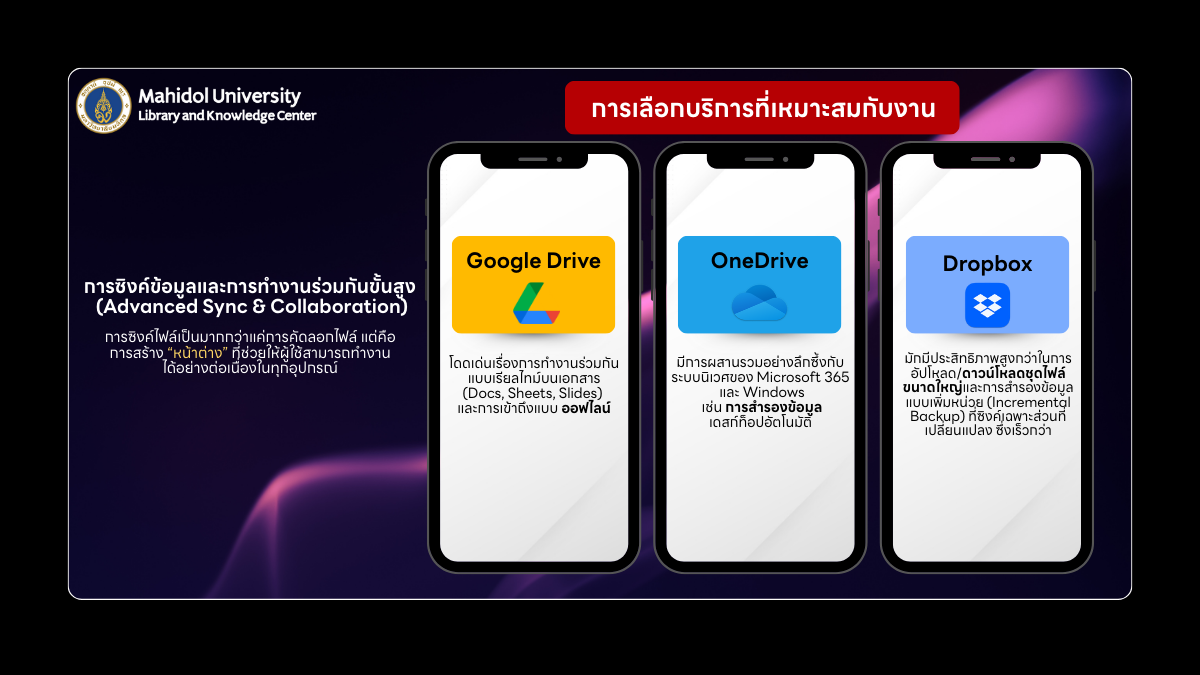 สรุป ดังนั้นแนวปฏิบัติที่ถูกต้องในการใช้บริการ Cloud เช่น Google Drive, OneDrive และ Dropbox คือการเพิ่มประสิทธิภาพการทำงาน ควบคู่กับการรักษาความปลอดภัยของข้อมูลในองค์กรและส่วนบุคคลอย่างเหมาะสม