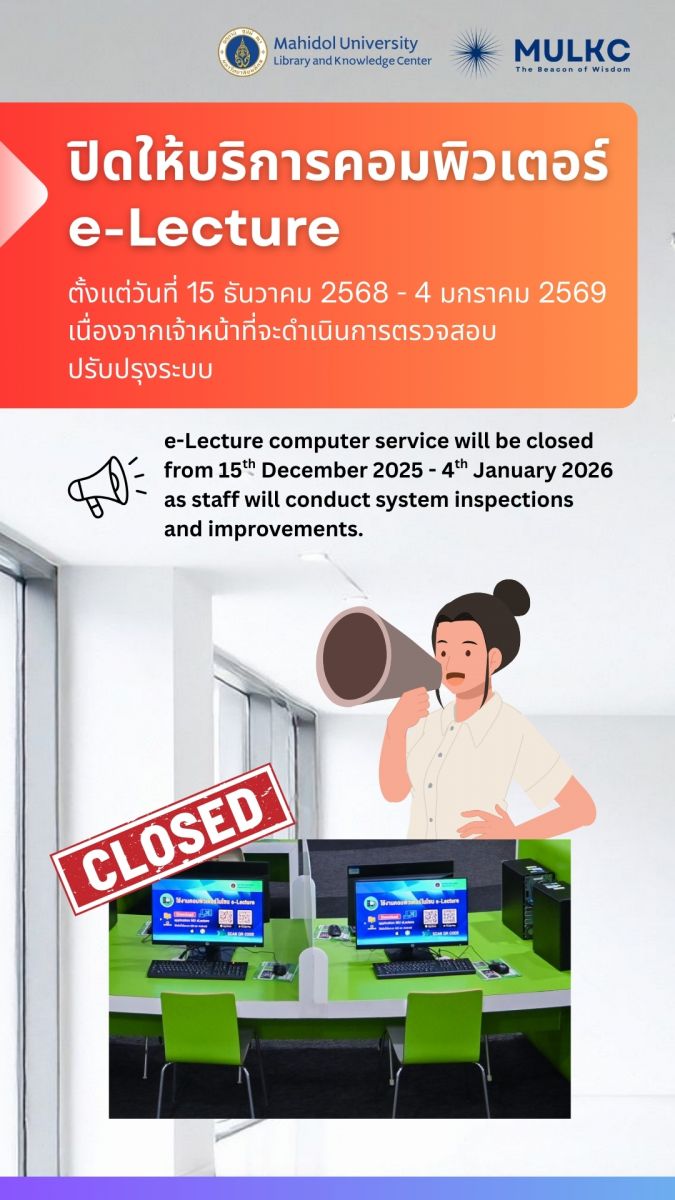 ปิดให้บริการคอมพิวเตอร์ e-Lecture จำนวน 118 เครื่อง ณ หอสมุดและคลังความรู้ฯ ในช่วงปิดภาคการศึกษา ตั้งแต่วันที่ 15 ธันวาคม 2568 - วันที่ 4 มกราคม 2569