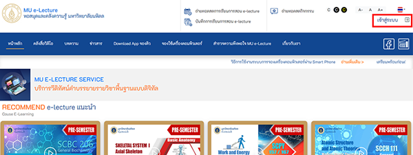 1. เข้าหน้าเว็บไซต์หอสมุดและคลังความรู้มหาวิทยาลัยมหิดล https://www.li.mahidol.ac.th/ เลือกไอคอน MU e-Lecture หรือเข้าสู่หน้าเว็บไซต์ MU e-Lecture โดยตรง URL: https://electure.li.mahidol.ac.th/th/home/index